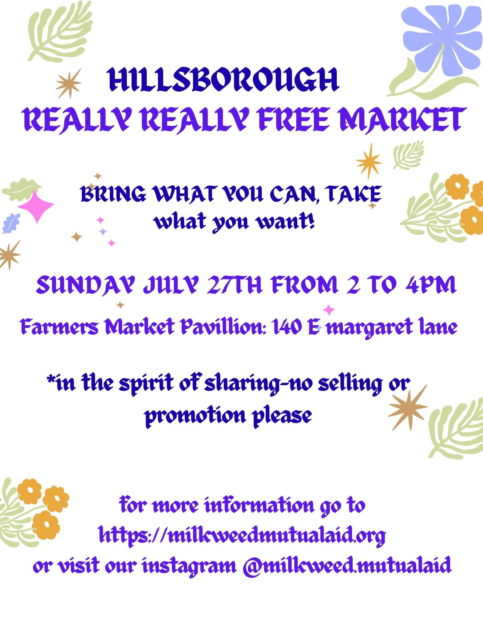 The next Hillsborough Really Really Free Market will take place at the Farmer's Market Pavilion at 140 E. Margaret Lane in Hillsborough on Sunday, 7/27 from 2-4pm. Starting with this event: We are asking that you take home any unclaimed items you brought. This helps us wrap up more quickly and potentially host markets more often!